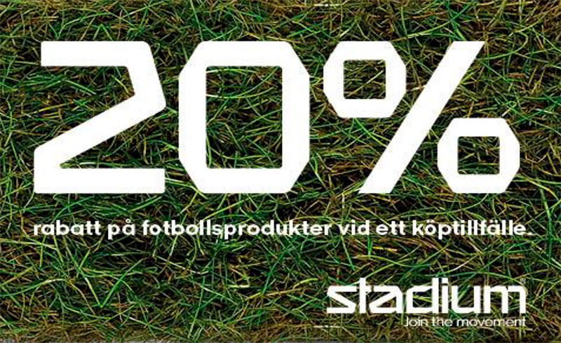 Gäller alla produkter på Stadiums fotbollsavdelning, skor, benskydd, träningskläder, bollar, mm. vid ett köptillfälle under perioden 27:e Februari - 30:e april -2017.
